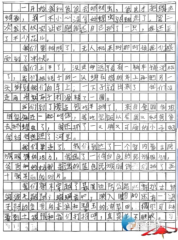 我们到了蒙古包吃羊排,来自全国各地的家庭在一起吃饭,我吃完饭以后又和爸爸去抓蚱蜢了,我还抓了一只又胖又可爱的小青蛙,我给它送进了河里。