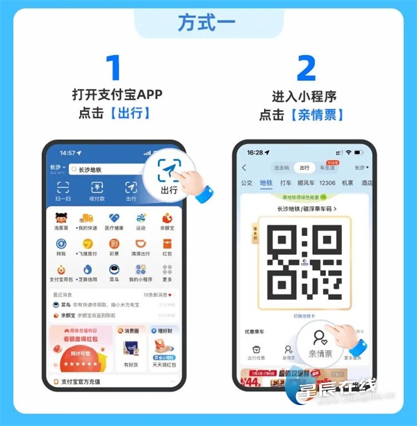 星辰在线9月1日讯(星辰全媒体记者 岳珊 彭穗 通讯员 刘琎)结伴出行,排队购票耽误行程?亲友同游,扫码过闸手忙脚乱?近日,长沙地铁联合支付宝正式上线“亲情票”功能。简单三步即刻开通“亲情票”: