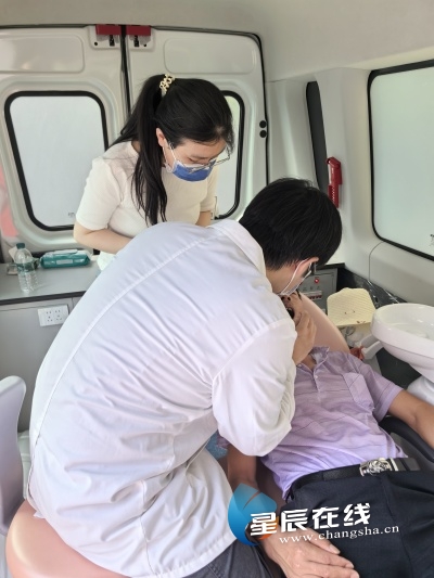 口腔义诊车旁,正确刷牙的科普视频循环播放,医生一边演示刷牙手法,一边提醒居民:“牙周炎会加重糖尿病症状,大家既要选对口腔护理产品,更要养成定期检查的习惯。”车内,口腔医生们细致地为居民做龋齿筛查、评估牙周健康,针对不同症状给出护理方案,贴心为大家答疑解惑,指导居民们护理口腔健康。