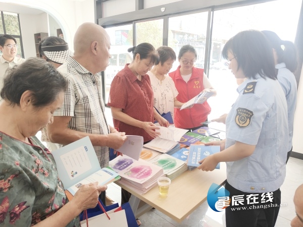 (工作人员向居民发放安全用药、用械宣传手册。以上图片均由 长沙市食品药品信息与审评认证中心 提供)