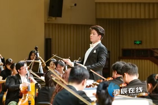 (青年指挥家刘峻玮执棒湘江爱乐乐团。)