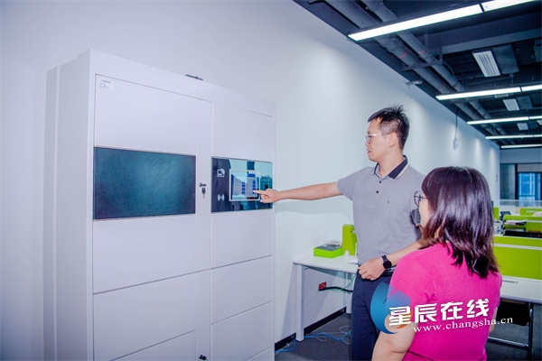 (为访客介绍公司自主研发的载体柜。图片均为 星辰全媒体记者 张奇涛/摄)