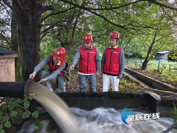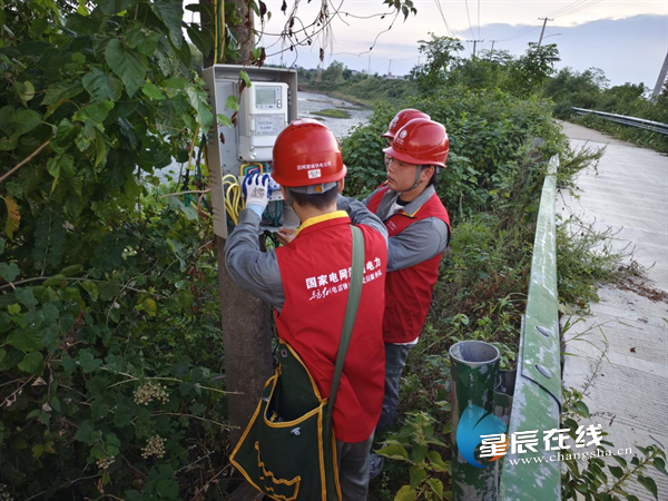 (国网望城区供电公司铜官供电所的“电雷锋”们检查排水设备。)