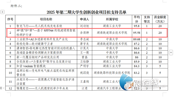 星辰在线9月24日讯(通讯员 苏江南)近日,湖南铁道职业技术学院“卓匠智培技术工作室”再传喜讯,由该校余雨婷老师牵头的师生共创团队所研发的“基于SFFNet的轨道侵限智能检测设备”,在株洲高新区2025年度大学生创新创业项目资助评审中脱颖而出,荣获最高档20万元无偿资助,成为株洲市首批获得该类支持的轨道交通项目之一。