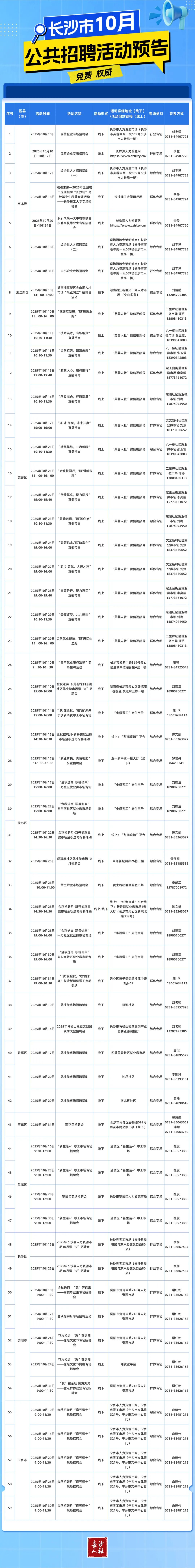星辰在线9月30日讯(星辰全媒体记者 刘孟妮)近日,星辰全媒体记者从长沙市人力资源公共服务中心获悉长沙市10月的公共招聘活动预告已出,全市线上线下共59场招聘活动,不要错过哦!