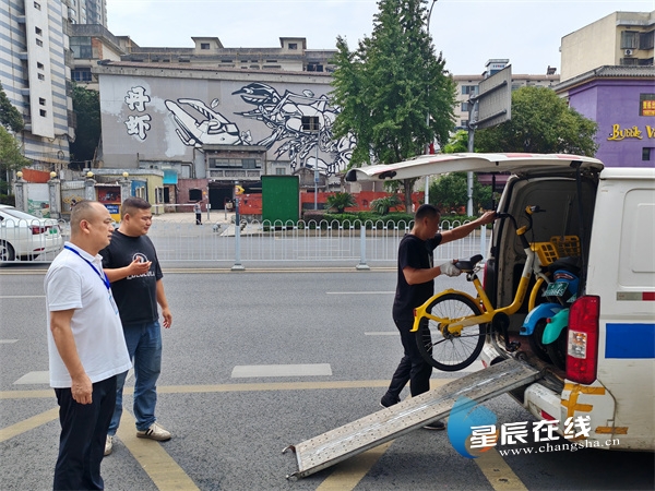 (长沙市城管局五一商圈督查专班成员挪走路边乱停乱放的共享单车。图为 受访者 提供)