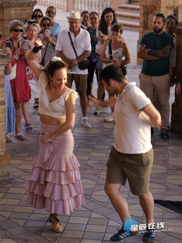游客可乘小舟轻漾,或乘坐马车穿梭于铺满暖色地砖的宽阔庭院。而最动人的,莫过于那些即兴起舞的游客——在廊下阴凉处,弗拉明戈的裙摆如火焰般旋转,吉他的旋律与踏响的节奏在拱廊间回荡,为这座静止的建筑注入了安达卢西亚炽热的灵魂。