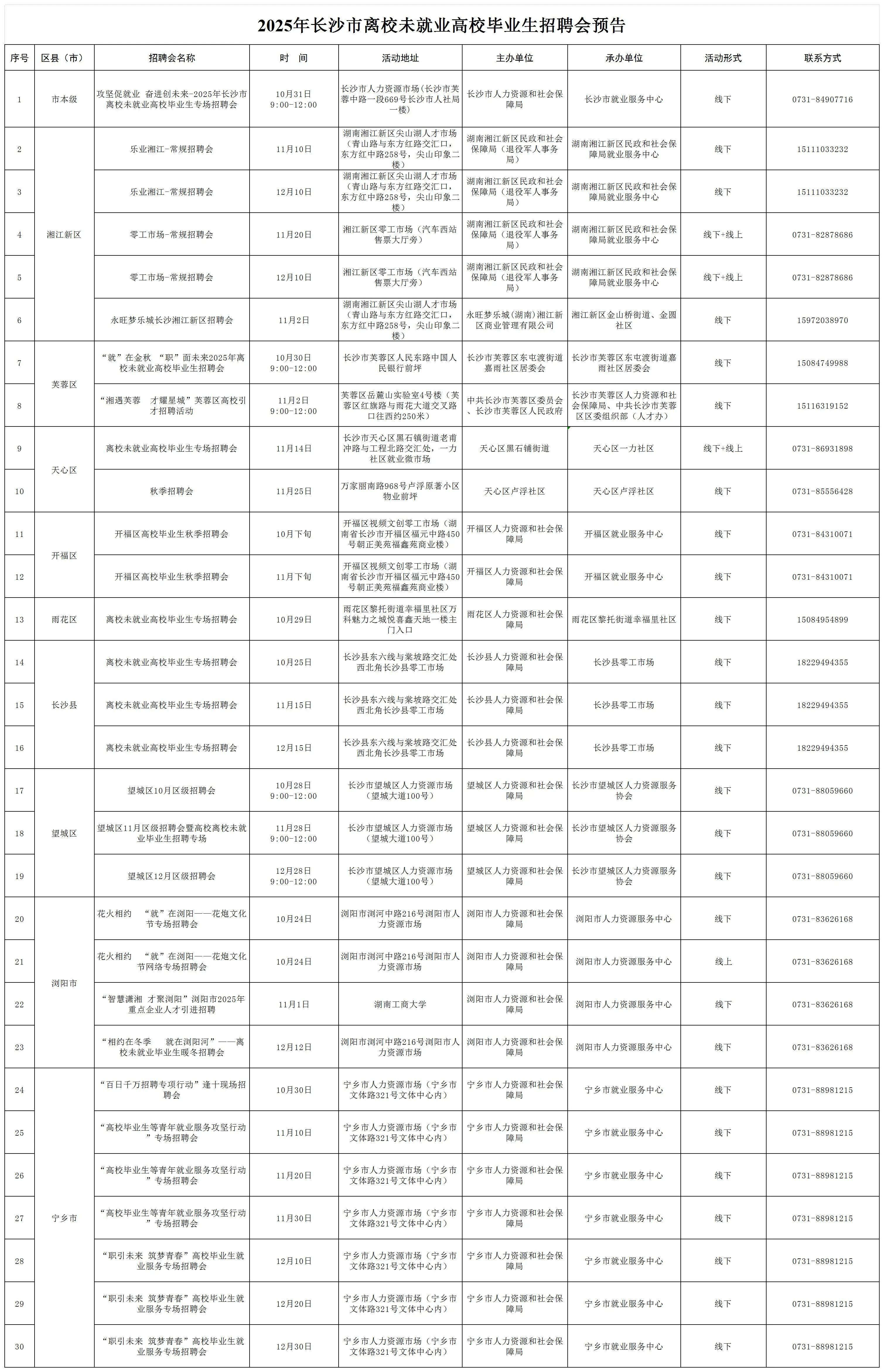 星辰在线10月22日讯(星辰全媒体记者 文春燕 )10月22日,记者从长沙市人社局获悉,为深入推进离校未就业高校毕业生就业服务攻坚行动,聚焦高校毕业生等青年就业创业需求,紧扣吸引和集聚高校毕业生留长来长的工作主线,10月至12月期间,长沙市将密集推出30场线上线下相结合的专场招聘活动。