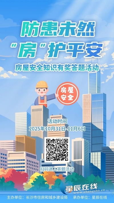 星辰在线10月31日讯(星辰全媒体记者 贺亚玲)2025年10月31日的“世界城市日”主题聚焦“城市安全与宜居”。为提升市民房屋安全意识与应急能力,长沙市住房和城乡建设局将于10月31日至11月6日,在官方微信公众号推出“防患未然 ‘房’护平安”房屋安全知识线上有奖答题活动,以轻松有趣的方式普及安全知识,共同筑牢城市居住安全防线。