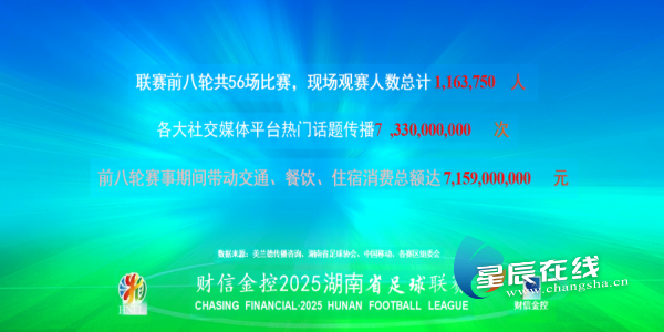 星辰在线11月4日讯(星辰全媒体记者 贺亚玲)一场贯穿三湘四水的绿色风暴正以前所未有的能量重塑湖南体育生态。11月3日,财信金控2025湖南省足球联赛(“湘超”联赛)媒体见面会在长沙举行,公布的前八轮数据显示:56场比赛吸引现场观众116.375万人次,社交媒体话题传播量达73.3亿次,直接带动交通、餐饮、住宿消费71.59亿元。这场以足球为支点的体育盛会,已超越单纯竞技范畴,成为推动区域经济、文化、社会发展的多维引擎。