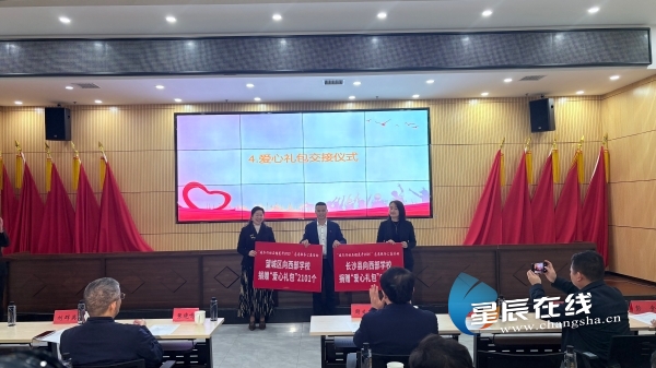 (爱心礼包交接仪式。)