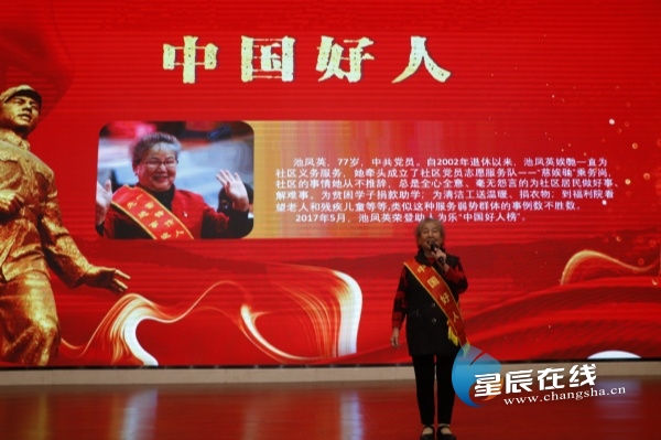 (“中国好人”池凤英现场分享数十年如一日服务群众的感人事迹。)