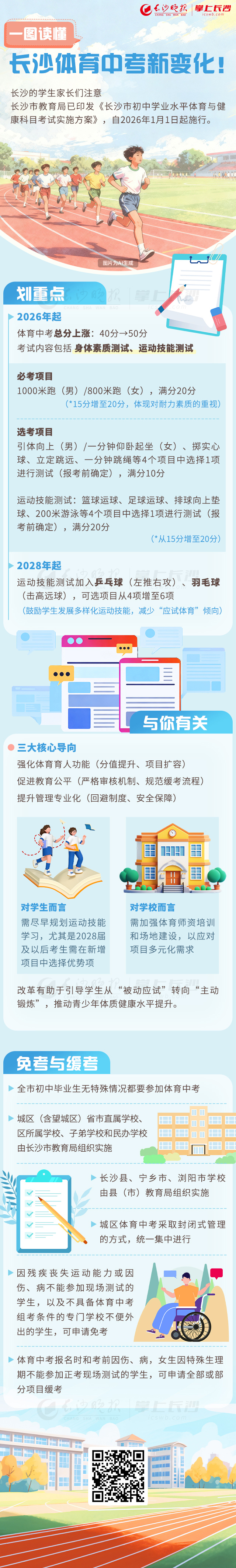 长沙的学生家长们注意,长沙市教育局已印发《长沙市初中学业水平体育与健康科目考试实施方案》,自2026年1月1日起施行。