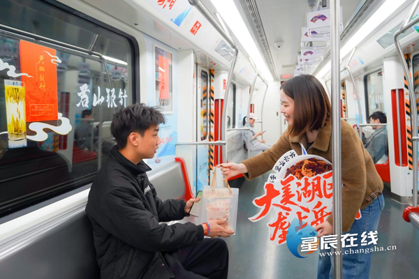 (在长沙地铁上,岳阳市农业农村局向乘客赠送“岳阳特色农产品礼包”。)