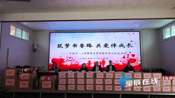 星辰在线11月14日讯(通讯员 陈朝曦 钟黎)一缕书香,一份真情;一次牵手,一路温暖。14日下午,岳阳市华容县梅田中学迎来了一场充满温情的爱心公益活动——“筑梦书香路 关爱伴成长”手拉手·小杜鹃情系华容梅田公益行动。长沙市青少年宫代表与全校师生齐聚电教礼堂,共同见证“小杜鹃爱心图书屋”的授牌暨物资捐赠仪式。