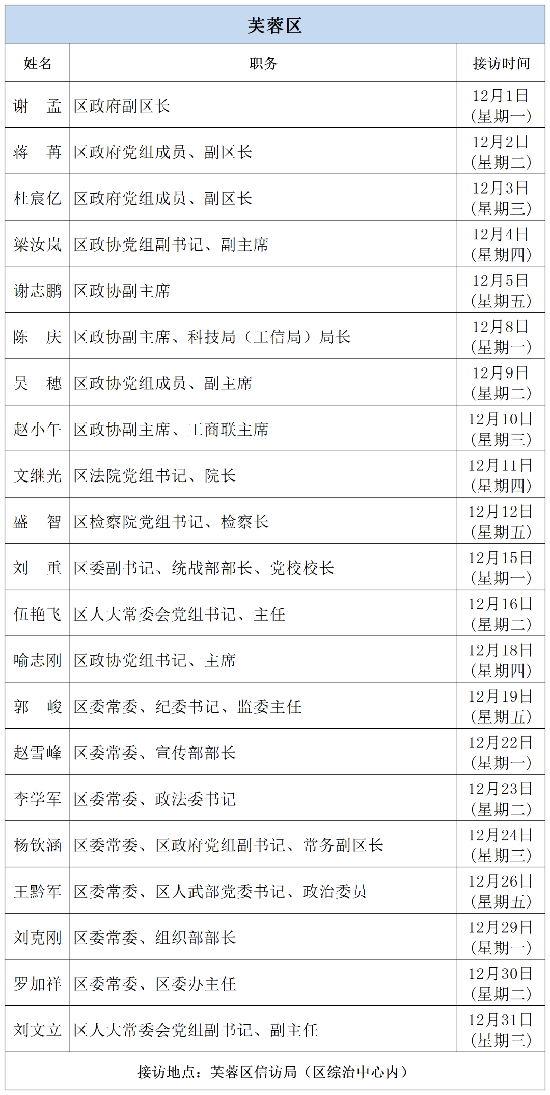 为密切联系群众,畅通信访渠道,依法及时就地解决群众合理合法诉求,现将2025年12月份湖南湘江新区、各区县(市)及相关市直单位(企业)领导接访安排予以公告,群众可根据公告的接访安排到指定地点反映诉求。