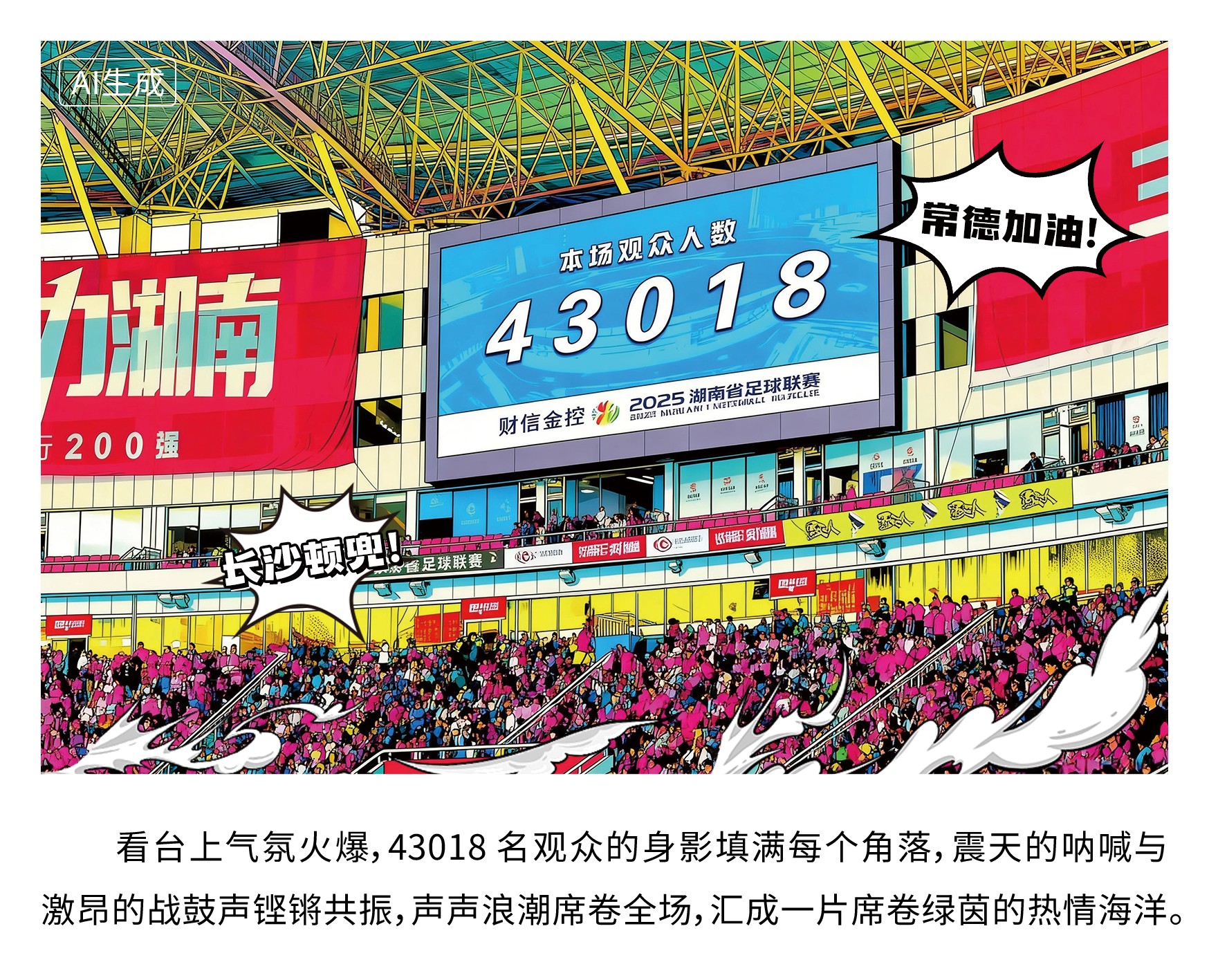 2025年12月6日,2025湖南省足球联赛(湘超)常规赛迎来最终轮关键战役,长沙队在主场与强敌常德队展开较量。本场比赛不仅是积分榜前两名的正面交锋,也是两座“英雄之城”在湘超舞台的荣誉相遇。此战共吸引43018名观众到场助威!最终长沙队以2:1战胜常德队,常规赛征程圆满收官。绿茵场上,球员全力拼搏,每次拦截、传递与攻门都扣人心弦;观众席间,球迷呐喊如潮,欢呼声阵阵回荡、席卷全场,火热气氛点燃了整个体育馆。(图片来源:长沙市体育局)
