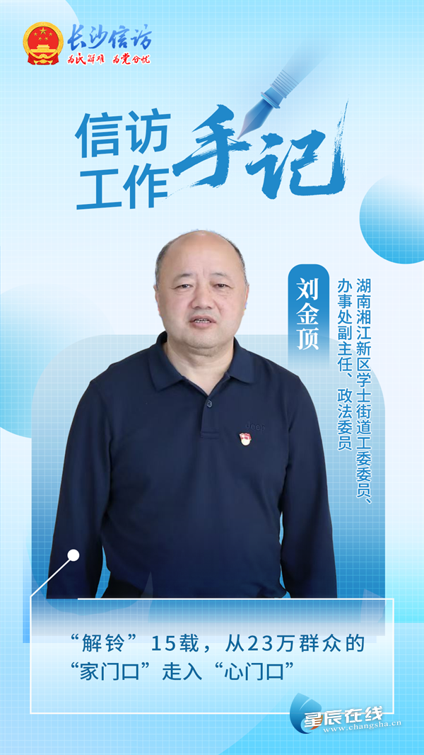 每一位信访人,都有一段故事。2024年4月8日起,长沙市信访局和星辰在线联合推出“信访工作手记”专栏,通过信访干部自述,展现长沙信访系统的风采和风貌,担当“为民解难、为党分忧”的政治责任,传递温暖和希望,传递法治和力量。今天,让我们一起关注湖南湘江新区学士街道工委委员、办事处副主任、政法委员刘金顶的“信访工作手记”。