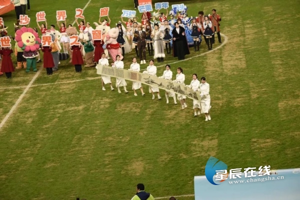 当晚最具份量的环节,莫过于 “赠旗仪式”。在万众瞩目下,开福沙坪湘绣非遗传承人与志愿者们,托举着三件重磅湘绣作品入场——《百福图》由潮宗街30多位绣娘与游客共绣,100个“福”字汇聚成对全场“开福运”的祝愿;《富春山居图合璧图》由江再红大师领衔绣制,以针线再现国宝“合璧”,寓意圆满;长沙队湘绣队旗采用“双面绣”绝技,由毛珊大师带队精心绣制,针线间尽显赛场动感与球队精神。