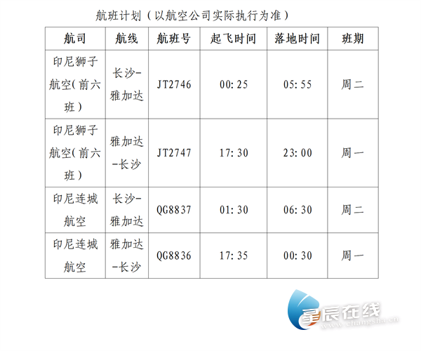 根据航班计划,长沙—雅加达航线自12月22日起执行,每周一班。前六个班次由印尼狮子航空执飞,后续由印尼连城航空接续运营,使用B737-8与A320NEO机型,飞行时长约5.5小时(以航空公司发布为准)。