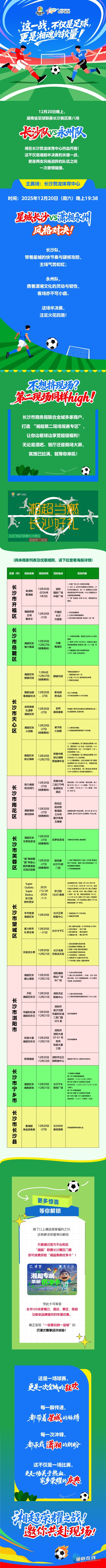 星辰在线12月20日讯(星辰全媒体记者 贺亚玲)热血对决,全城共燃!12月20日(周六)晚19:38,湘超联赛半决赛焦点战将在长沙贺龙体育中心震撼开踢,常规赛保持不败的长沙队坐镇主场,迎战以“黑马”之姿逆袭晋级的永州队。这场“星城快节奏硬核攻防”与“潇湘灵动韧性”的风格碰撞,不仅将点燃赛场激情,更将通过遍布全城的51处“观赛第二现场”席卷星城——各大商场、特色街区、文旅地标同步开启直播狂欢,惊喜福利、趣味互动、地道美食轮番上阵,让无法亲临现场的市民沉浸式解锁“看球+消费+社交”的多重快乐,共赴属于长沙的足球狂欢夜。