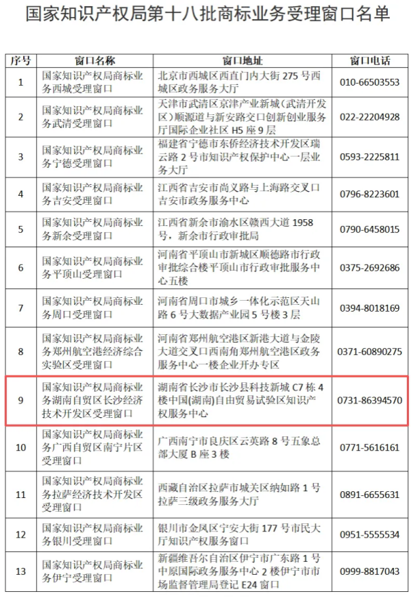 公告名单显示,“国家知识产权局商标业务湖南自贸区长沙经济技术开发区受理窗口”成功获批设立。该窗口正式运行后,可为区内及周边企业提供商标注册、变更、续展等一系列业务的直接受理服务,显著节省企业时间与成本。
