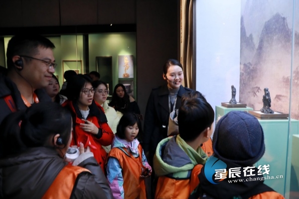 探景环节结束后,亲子家庭在湘博教育员的引导下从烈士公园移步湖南省博物馆,开启“潇湘石韵——湖南博物院藏石雕精品展”的赏石之旅。在珍贵的馆藏石雕前,孩子们认真聆听讲解,感悟自然奇石与人文巧工的完美融合,感受湖湘文化的深厚底蕴,实现了从自然景观到人文瑰宝的文化延伸。
