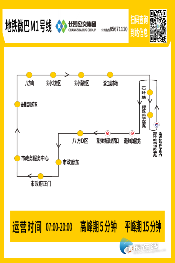 在发车频次上,线路充分适配客流潮汐特征,工作日早晚通勤高峰时段每5分钟便有一班车发出,平峰及节假日发车间隔为15分钟,较传统公交线路大幅缩短候乘时间,有效缓解通勤时段出行压力。核心停靠站点经过精心筛选,包括市政务服务中心、含光路观沙路口、长沙市实验小学、观沙岭地铁站4号口、八方小区,通过精简非必要停靠站点,强化“市政务服务中心—观沙岭地铁站”的直达效率。值得注意的是,市政务服务中心站为移动站点,可根据乘客需求灵活停靠市政府正门站、市政府站,进一步提升服务精准度。