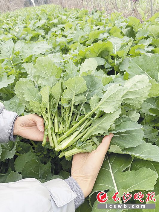 除了油菜薹,目前联彩农业生产基地还种有青崎菜心、豌豆尖苗等,日均产量达到1吨,供应可一直延续至年后。“通过水肥一体化、品种改良等技术,菜心一年能种7茬。”肖志祥提到,种植过程中,由长沙市农业科学研究院提供技术支持,保证了产量和口感稳定。