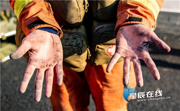 (他们的脸庞和双手被炭灰染黑,长时间紧握扑火工具的手掌上布满了水泡——这是守护星城绿水青山最真实的勋章。)