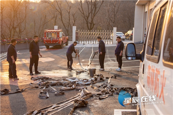 (队员们对用过的水带进行清洗和晒干,以此来延长水带的寿命。)