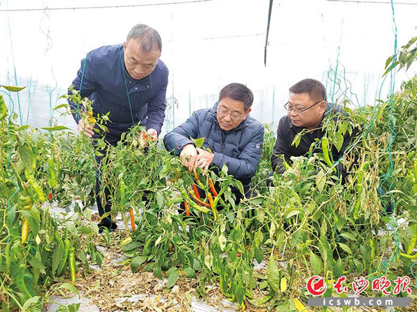 在长沙县越丰生态农业基地大棚,李雪峰(中)、周晓波(右)和基地负责人周亚民查看辣椒保温情况,并叮嘱注意细节。长沙晚报全媒体记者 徐运源 摄