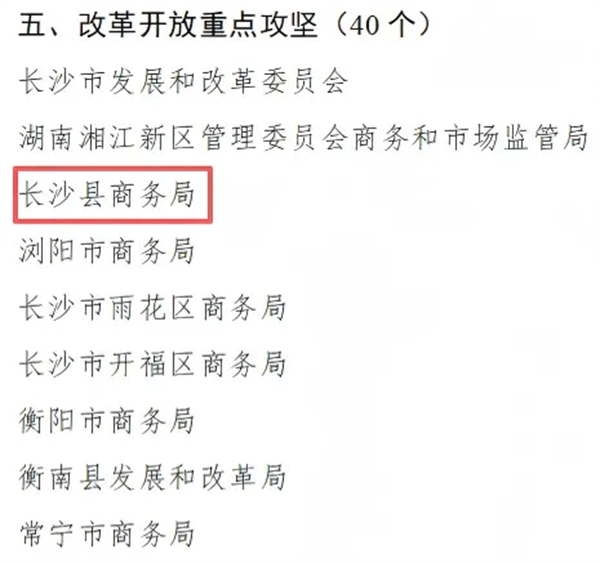 星辰在线1月19日讯(星辰全媒体记者 岳珊 彭穗 通讯员 宋彬彬 李依露)近日,湖南省人民政府发布《关于对实施“七大攻坚”表现优异单位予以表扬的通报》,长沙县商务局、长沙县发展和改革局榜上有名。