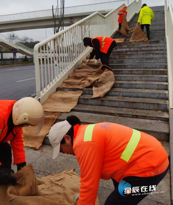 (环卫工人在过街天桥阶梯上铺设防滑麻袋。图片由 通讯员 提供)