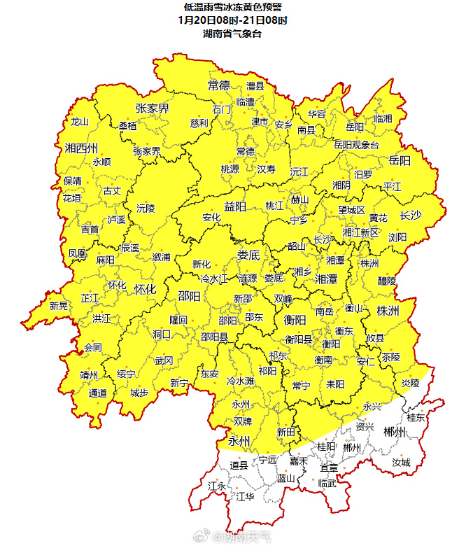 湖南省气象台1月20日07时发布低温雨雪冰冻黄色预警:预计20日8时至21日8时,全省大部分地区将出现冻雨、雨夹雪或雪,且最低气温将低于0℃。