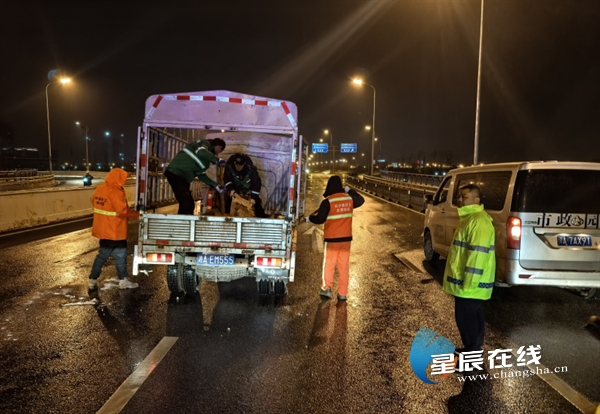1月19日晚至20日清晨,城管队伍与维护人员坚守岗位、不间断作战,重点对机场大道、人民东路、开元路、星沙大道、星沙联络线、长沙收费站出入口,以及政府、学校、大型商超周边等12个核心区域,开展拉网式巡查防控,同步完成城区82座桥隧的安全排查,实现安全隐患无死角、全覆盖。此次应急处置共出动人员350余人次,调配撒盐机3台、工程车辆70台次,铺设防滑麻袋5000余条,撒布融雪盐12.6吨,以科学处置防范路面结冰风险。