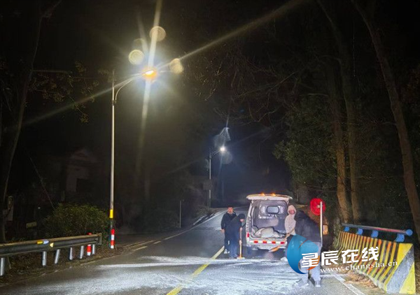 19日夜间至20日凌晨,长沙县交通运输局4支常备公路应急队伍、共计39名应急人员全员进入实战状态,严格执行24小时备勤机制,携带除冰设备与物资,奔赴辖区各易结冰路段和桥梁,连夜开展融雪剂撒布、警示标志设置和暗冰清除作业。