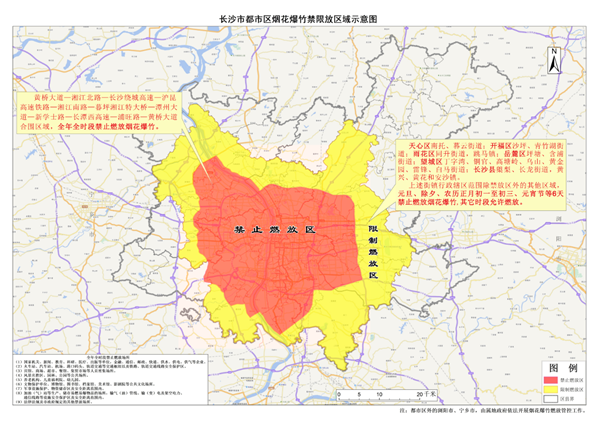 自觉遵守,践行文明。长沙市按照全省烟花爆竹联防联控统一部署,对长沙六区一县的烟花爆竹禁限放区域进行重新划定,在黄桥大道—湘江北路—长沙绕城高速—沪昆高速铁路—湘江南路—暮坪湘江特大桥—潭州大道—新学士路—长潭西高速—浦旺路—黄桥大道合围区域内,全年全时段禁止燃放烟花爆竹;在天心区南托、暮云街道;开福区沙坪、青竹湖街道;雨花区同升街道和跳马镇;岳麓区坪塘、含浦街道;望城区丁字湾、铜官、高塘岭、乌山、黄金园、雷锋、白马街道;长沙县㮾梨、长龙街道,黄兴、黄花、安沙镇行政辖区范围除禁放区外的区域内,元旦、除夕、大年初一至初三、元宵节等6天,禁止燃放烟花爆竹,其他时段允许燃放。鼓励大家选择电子鞭炮、喜庆音乐、悬挂灯笼、张贴春联等安全、环保、文明的方式欢度节日,以新风尚表达祝福、传递真情。