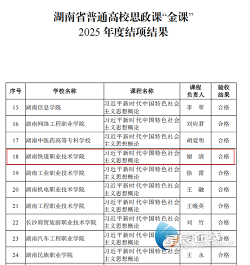 星辰在线1月27日讯(星辰全媒体记者 文春燕 通讯员 邹莹)近日,湖南省教育厅公布普通高等学校思政课“金课”2025年度结项结果,由湖南铁道职业技术学院马克思主义学院副教授谢清主持的“习近平新时代中国特色社会主义思想概论”课程通过验收,被认定为省级思政课“金课”。这是该校继“毛泽东思想和中国特色社会主义理论体系概论”“思想道德与法治”之后,第3门获批的省级思政课“金课”。