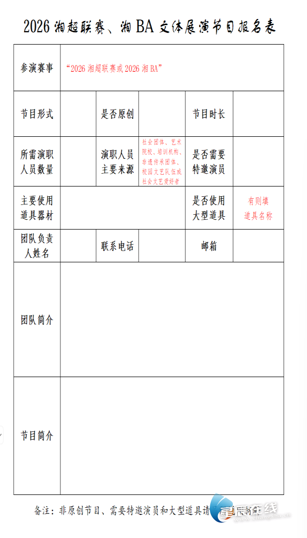 报名时间自公告发布之日起至2026年2月28日,报名者需提交填写完整的报名表、节目高清视频小样及联系方式,通过指定邮箱1701964875@qq.com提交(邮件主题注明“湘超/湘BA文体展演+节目名称”),咨询电话0731-89662981可解答相关疑问。组委会将组建专业团队评审,入选节目将登上长沙赛区主场赛事舞台,获颁证书、千万级媒体曝光及后勤保障补贴,表现突出者还将获后续活动合作邀约。