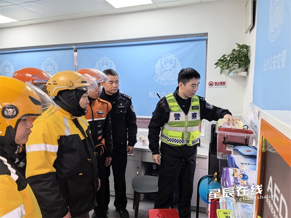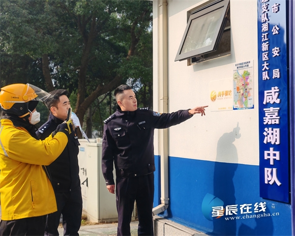 (长沙交警为骑手介绍交警岗亭骑手驿站点位安排。)