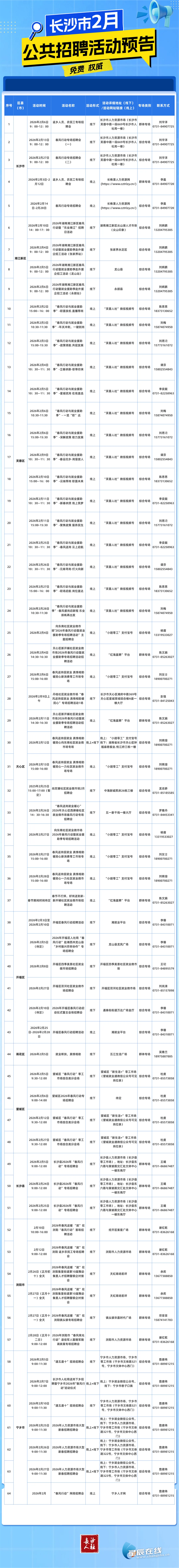 星辰在线1月30日讯(星辰全媒体记者 刘孟妮)正在找工作的小伙伴,2月的公共招聘活动预告出炉啦!长沙市线上线下共64场招聘活动,不要错过哦!