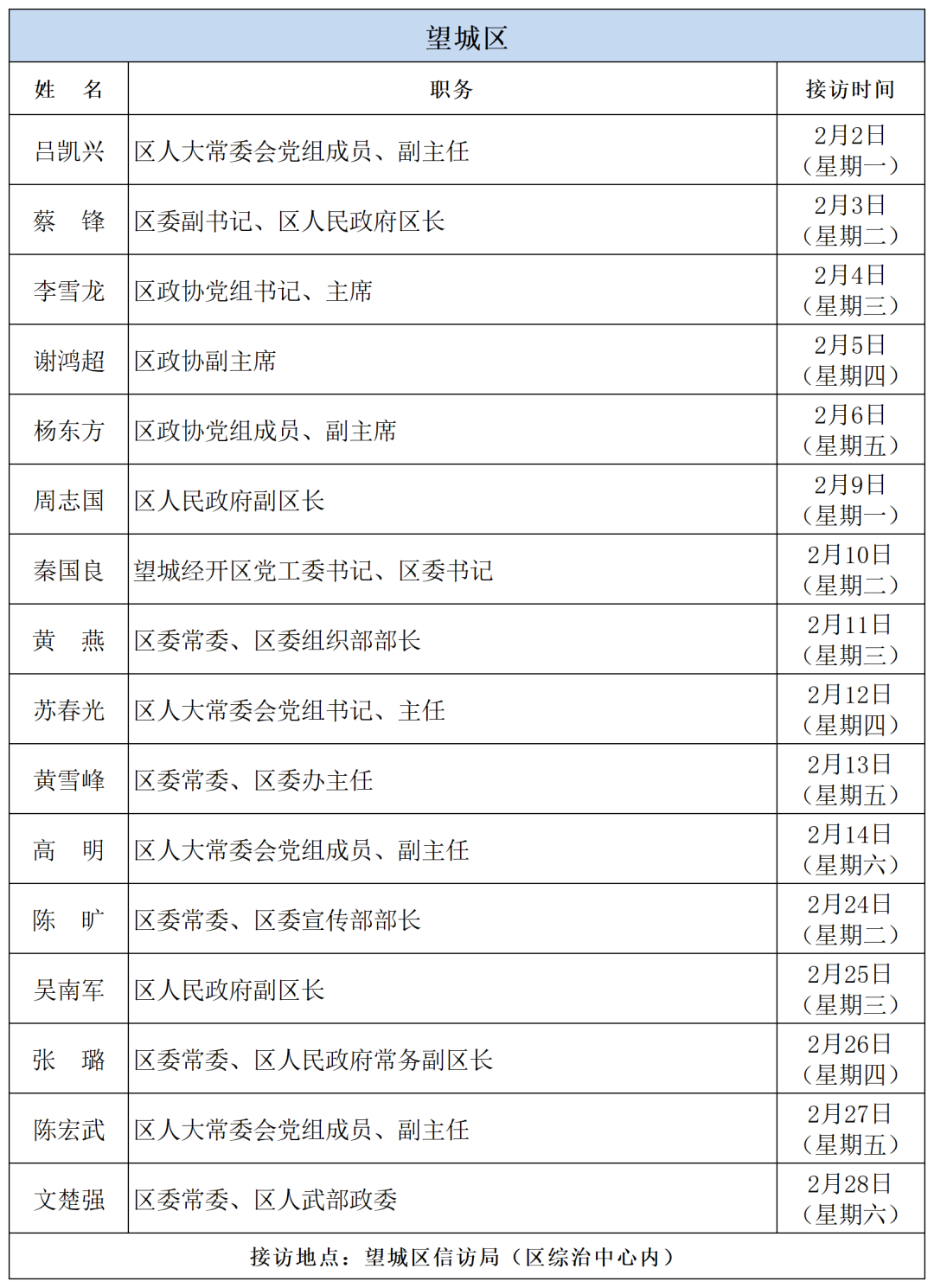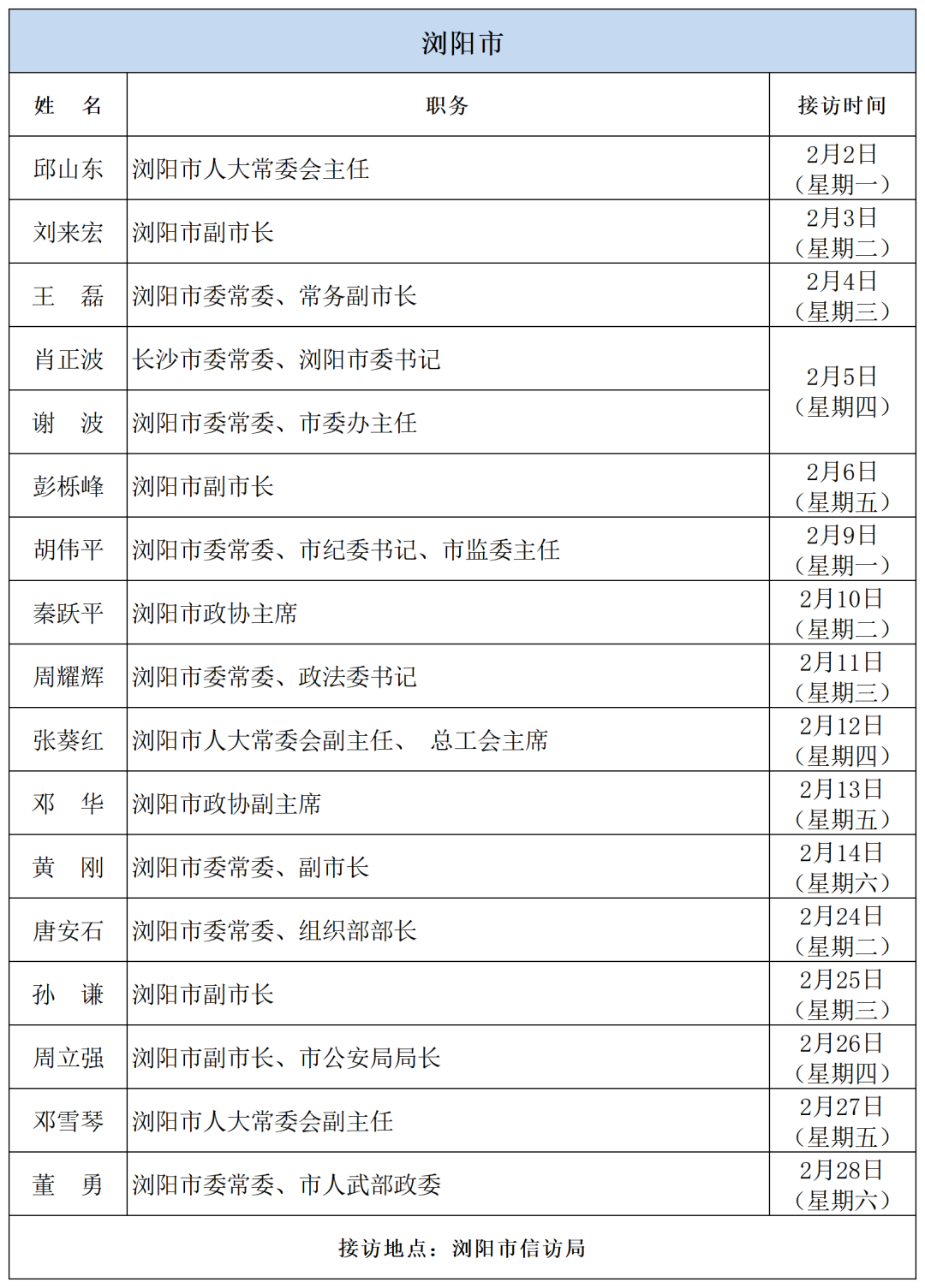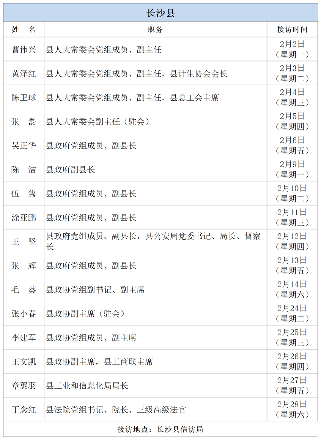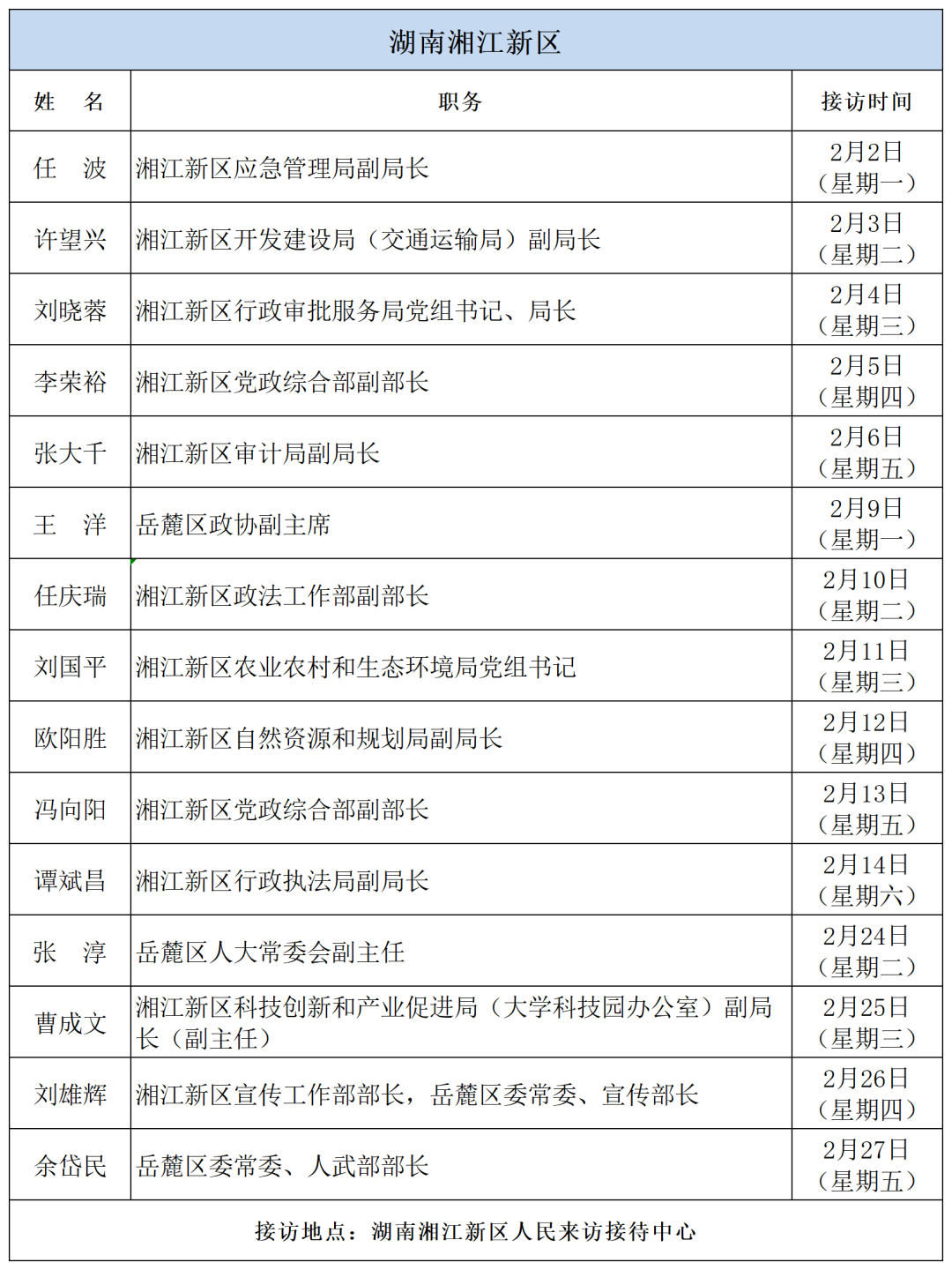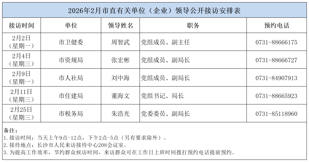 公告 | 2026年2月湖南湘江新区、各区县(市)及相关市直单位(企业)领导接访安排