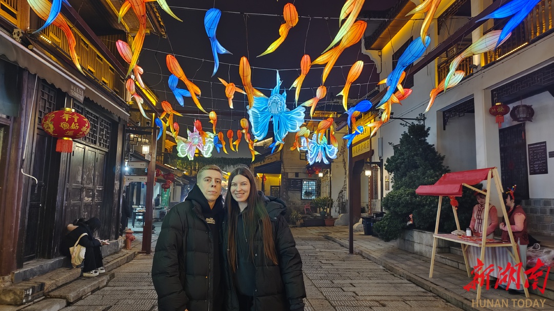 “太好看了,太美了!”得知今晚有灯会,俄罗斯游客马克西姆和阿妮特意把靖港古镇纳入行程,看完后直呼不虚此行。