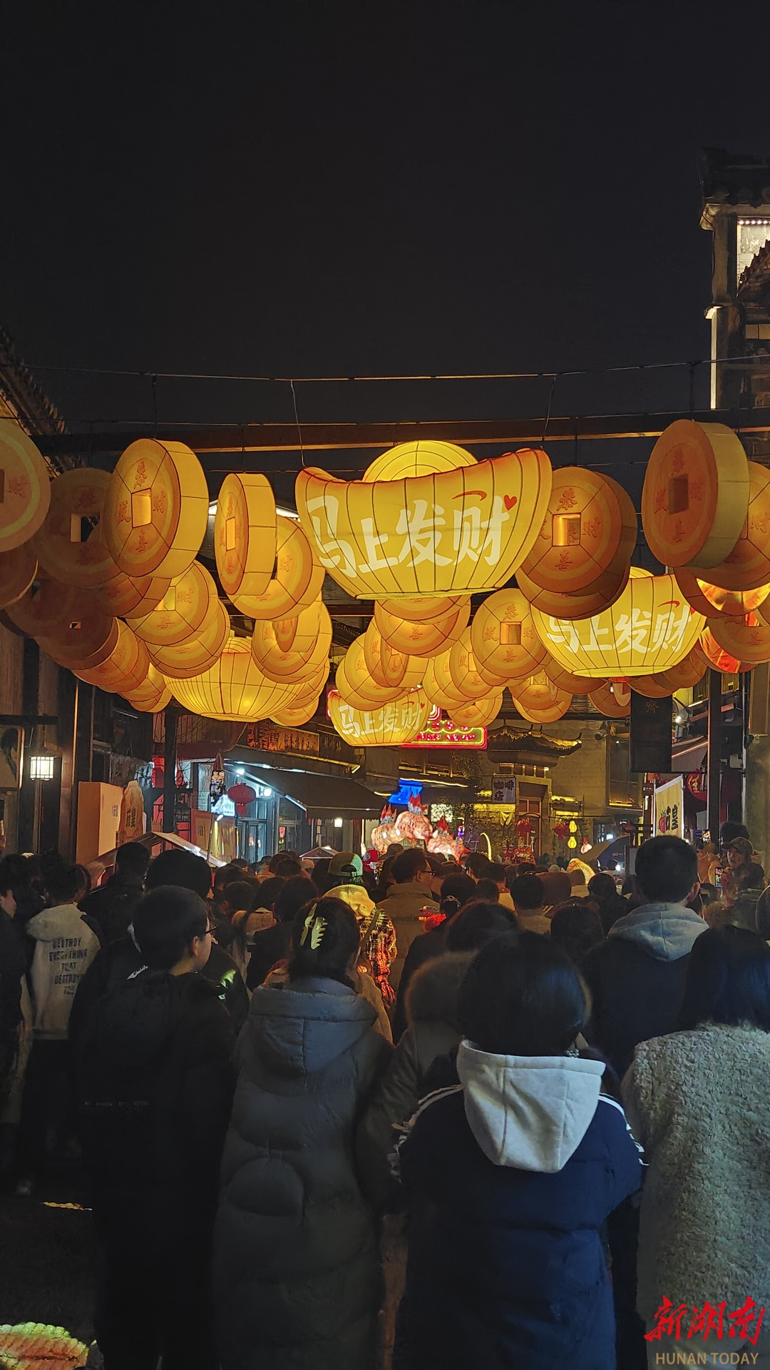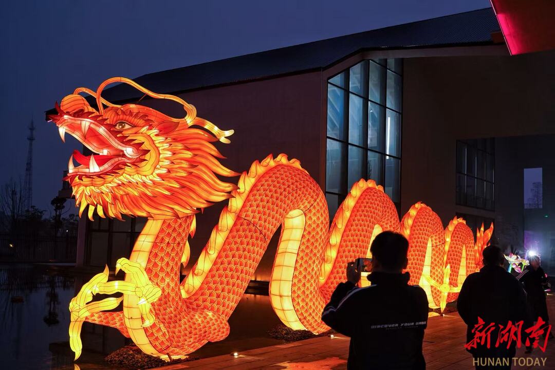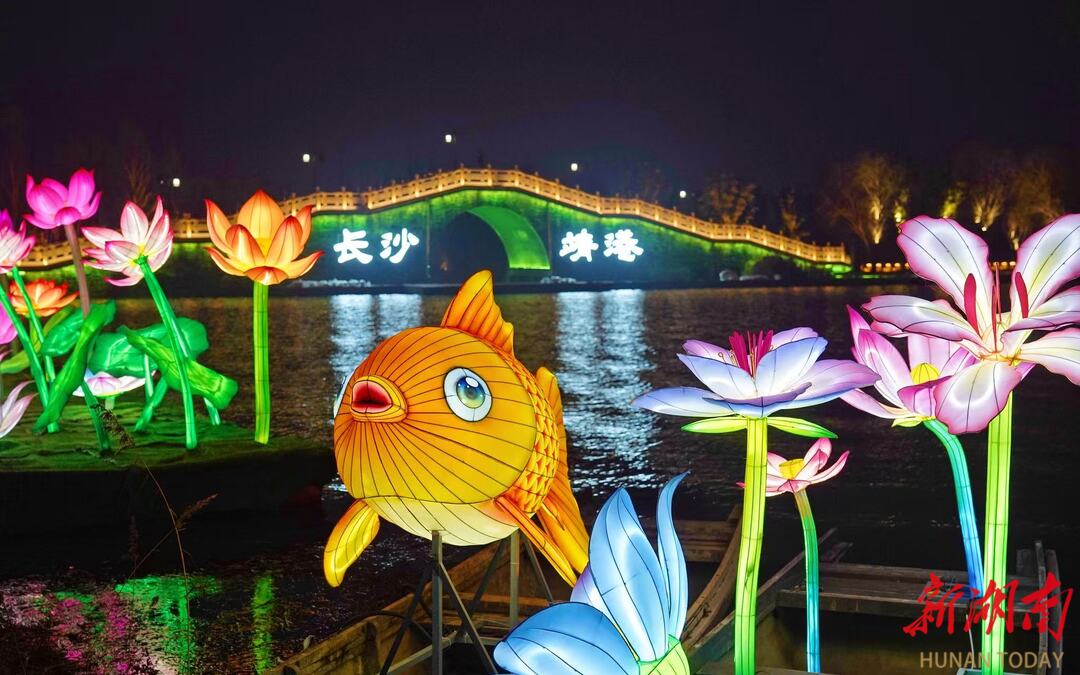 水上花船熠熠生辉,古街老巷亦灯火辉煌。绚丽的巨型鳌鱼引领巡游队伍蜿蜒前行,重现“一夜鱼龙舞”盛景。街巷中,剪纸、湘绣、皮影戏等湖湘年俗化身彩灯艺术,“马上有福”“马到功成”等马年特色灯组年味满满。