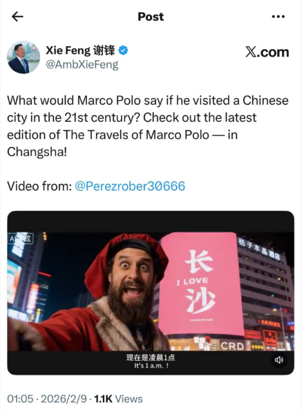(中国驻美大使谢锋在社交媒体上转发了星辰在线原创的AI视频——《In Changsha:马可·波罗“新游记”》)