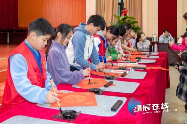(在湖南烈士公园,小朋友们正在专心书写新春祝福。)