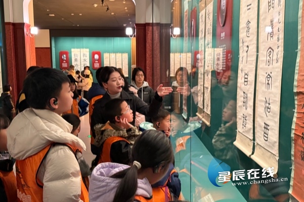 下午14时,活动转入湖南省博物馆专场,15组7至16岁亲子家庭在博物馆教育员的专业讲解下,走进“潇湘入海是通津——民国寓沪湖南书画家作品展”。80余件晚清民国书画佳作与文献资料静静陈列,教育员生动讲解作品背后的历史故事与笔墨技巧,带领青少年沉浸式感受湖湘书画的独特意境与深厚文化内涵。活动尾声,参与家庭纷纷加盖“馆园融合”系列月章,为这场兼具知识性与趣味性的文旅联动之旅,留下了专属纪念。