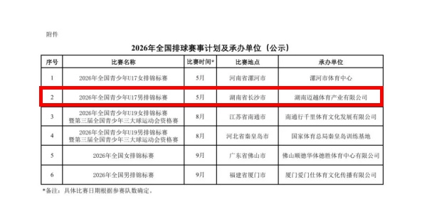星辰在线2月13日讯(星辰全媒体记者 贺亚玲)从中国排球协会官网传来消息,2026年全国青少年U17男排锦标赛落户长沙,赛事定于5月燃情启幕。