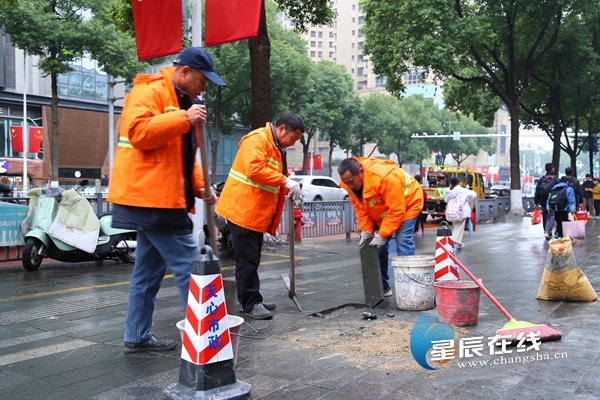 在保障头顶“亮化”的同时,地面的“市政”安全同样一丝不苟。2月19日,天心区市政中心的一线维护值班分队依旧奋战在作业一线。在繁华的解放西路,施工人员正在对人行道板松动断裂问题进行紧急处置。正值春节假期,五一商圈及解放西路周边人流量巨大,市政维护人员通过快速修复破损路面,有效消除了安全隐患,确保了广大人民群众和外地游客的“脚下安全”。
